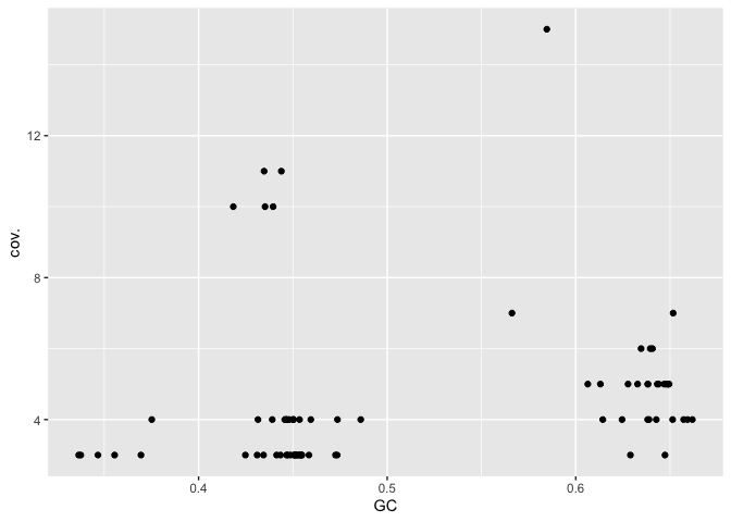 Now let’s create some plots in R to explore the GC and coverage of contigs in a slightly more general way.