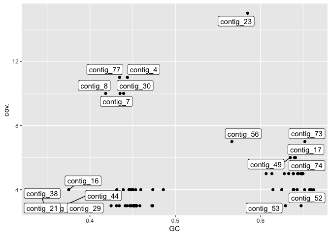 ggplot(aes(x=GC,y=cov.)) + geom_point() + geom_label_repel(aes(label=`#seq_name`))